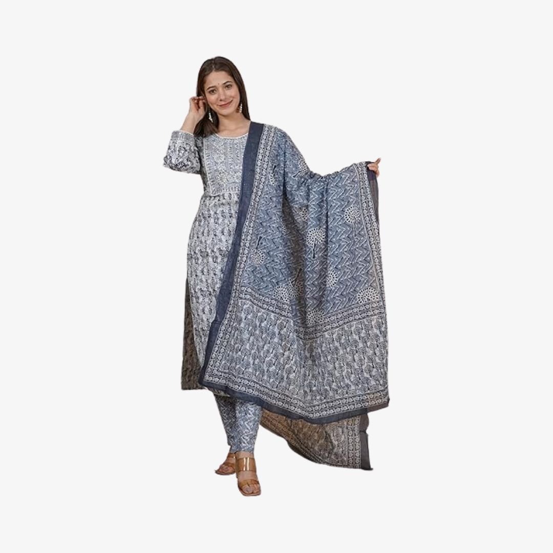 Women’s Cotton Printed Grey Printed Straight Embroidery Kurta With Palazzo & Dupatta